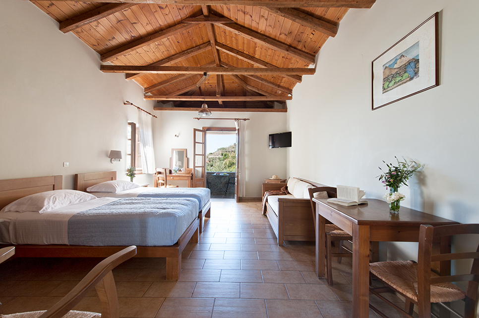 Located in the main building, the Double Rooms offer lovely views over the gardens and olive groves toward the sparkling blue sea. These rooms include: